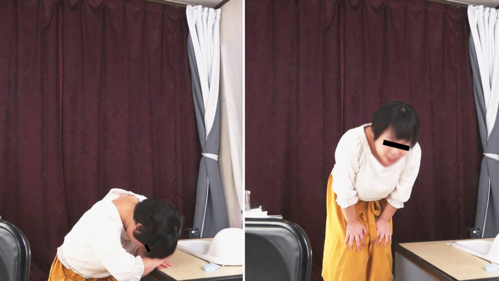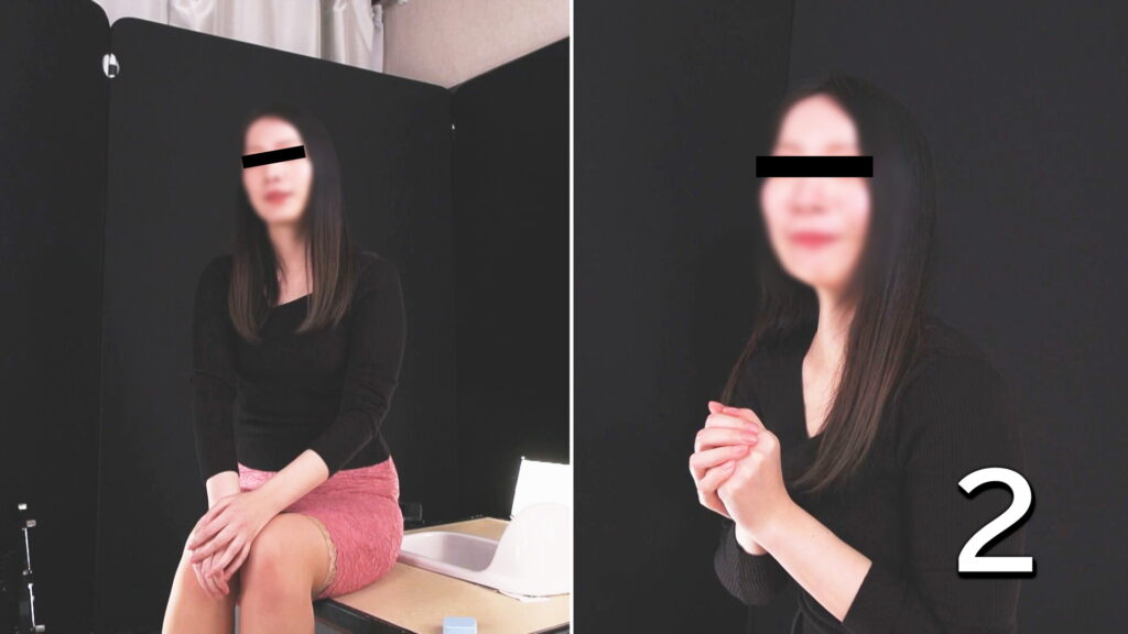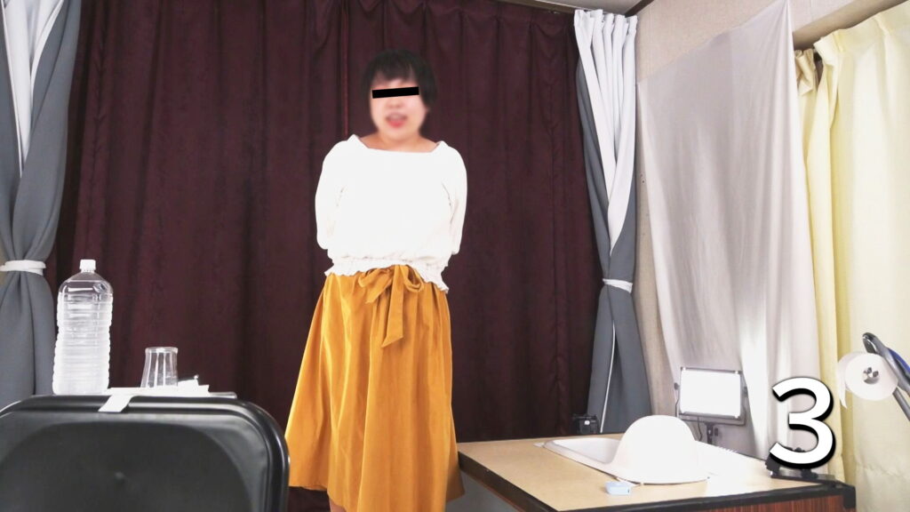 「トイレ行きたいどうしよう」と言いながら水を飲む彼女。矛盾しているようにも見えます。一問一答が終わってからの彼女は立ち上がったり、股間を抑えたり、足をクロスにしたりと、時間は短いですが、仕草に興奮します。