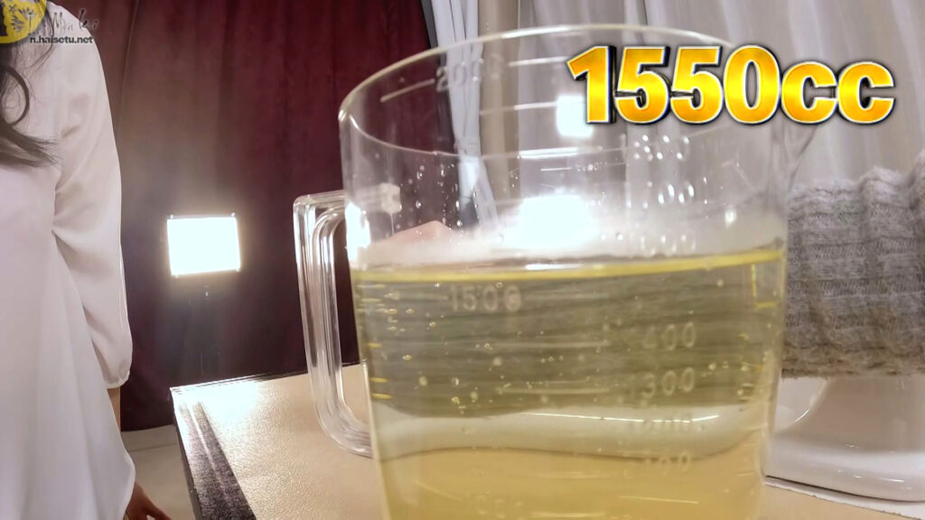 尿量は1300mlもありました。これでも彼女の中では記録が下振れなんですよ。どうなってんのよ笑 ちなみに彼女は計4回のおしっこが収録されていますが、全て収録日は同じで今回が最初なので、おしっこの色は今回が一番濃いです。これでも薄いですが笑