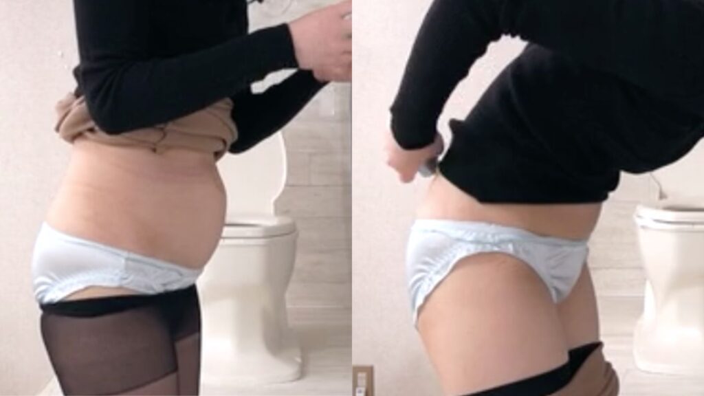 時折パンパンの下腹部をさする場面もありますし、彼女にしては珍しく股間を押さえる場面もあるので見逃さないでください!!