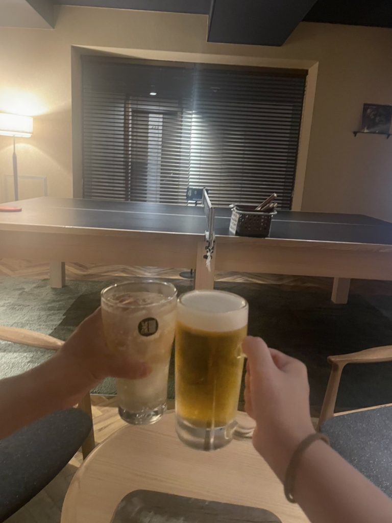 いやいや事前に買った缶の酒は飲まんのかーーーーーいっwwwwwww 結局1杯目は卓球やりながら酒が飲める、ホテルのラウンジを使用しました。いや買ってきた缶酒を飲めよ。しかも風呂上がりに卓球でまた汗だくだよw 色んな意味で意味ねーーーよw