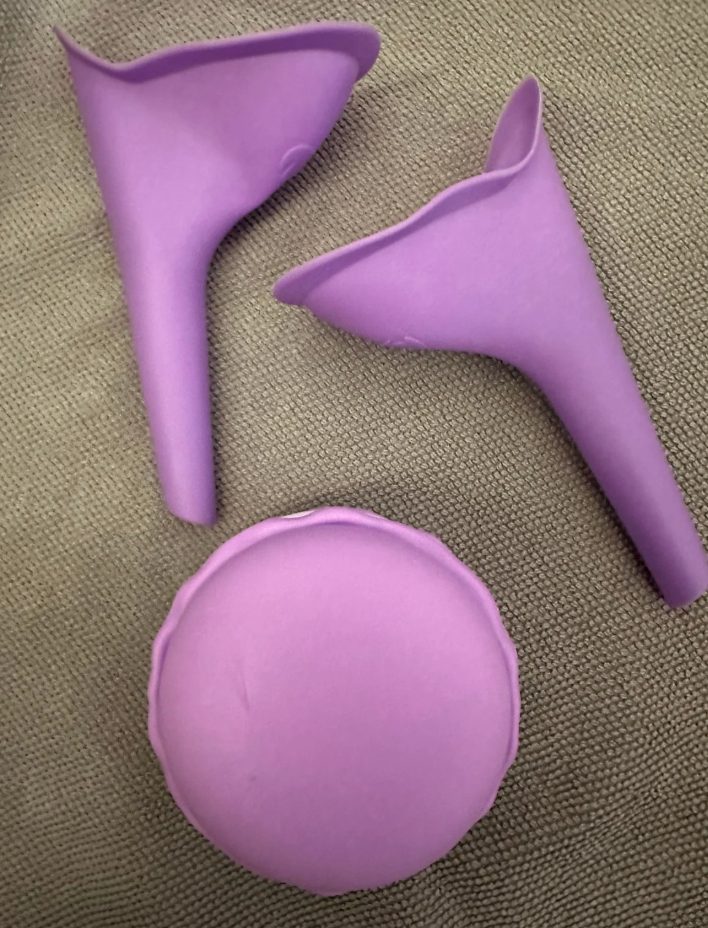 女性用の立ち小便器でございます。商品名はEsiFareっていうみたいです。知らんけど。ちなみに下のデカいマカロンみたいなヤツは一応ケースみたいなんですが、正直要らんのよねw なんか2個セットで、今ならケースも付いてきますみたいに売られてたんで、適当にAmaz◯nで購入しました笑