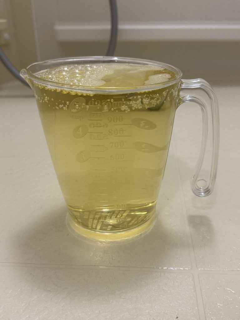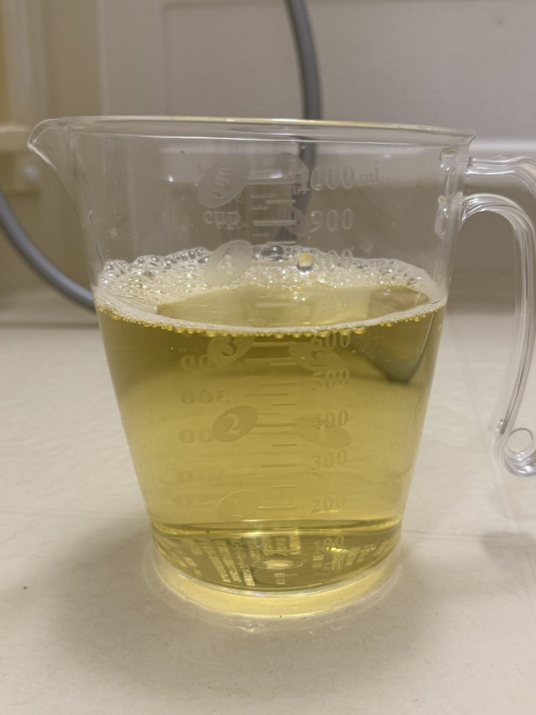 もちろん終盤のおしっこの勢いは衰えるのが普通ですし、それを考えると1400mlくらいだと考えるのが妥当でしょうか?今後はもっと大きいカップや洗面器にするか、計量カップがもう一つあればいいですねー。