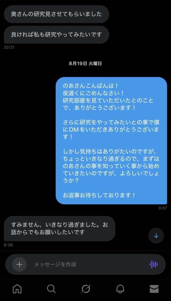 なんとありがたい事に、僕のXアカウントにDMをしていただいた方がいらっしゃいました。はじめはあまりに突然だったので、ちょっと怪しんだりしてしまったんですが、話を進めていくうちに徐々に「この人なら大丈夫かな?」と思うようになりました。