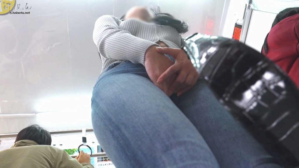 そんな彼女は電車が止まるシーンからスタート。トラブル後も無言のまま、足を動かしたりしていました。パツパツのデニムにロングブーツなので、好きな方も多いと思います。